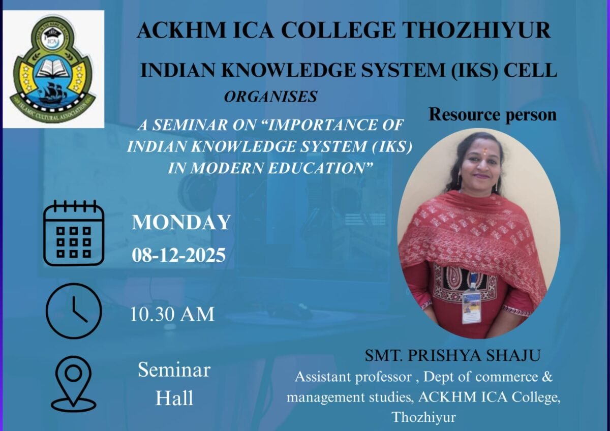 Categories Programmes SEMINAR ON INDIAN KNOWLEDGE SYSTEM REFLECTED IN KERALA LITERATURE Post author By Department of Commerce Post date January 13, 2026 No Comments on SEMINAR ON INDIAN KNOWLEDGE SYSTEM REFLECTED IN KERALA LITERATURE